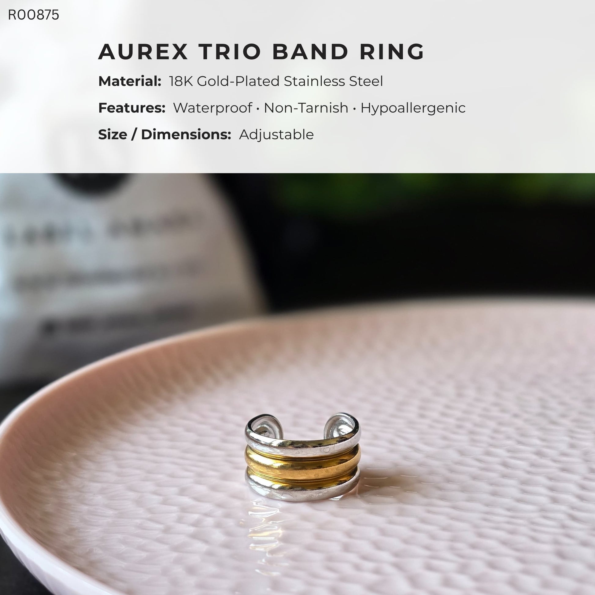 Redefine modern elegance with the Aurex Trio Band Ring, a symbol of balance, beauty, and timeless sophistication. Crafted from 304 stainless steel, this open ring showcases three fused bands — two in silver tone and in 18K gold plating.