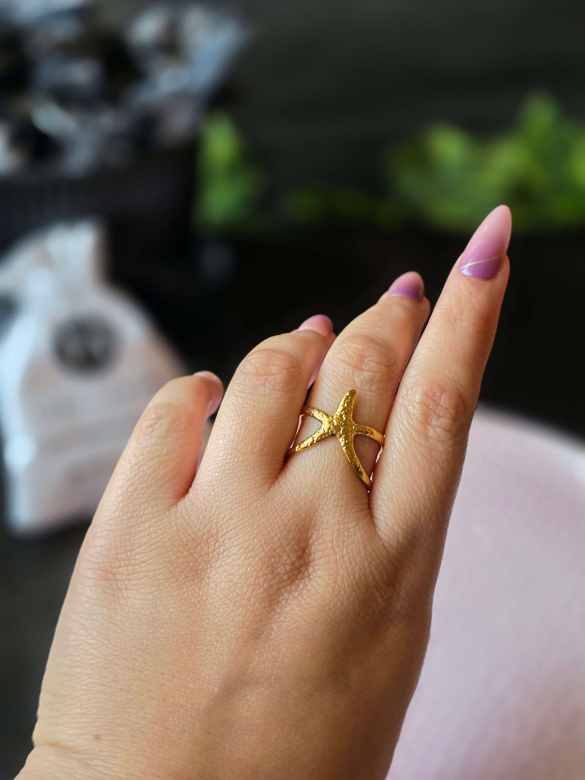 Bring the ocean’s beauty to your fingertips with the Aveline Reef Ring, a striking expression of coastal luxury. Crafted from 304 stainless steel and plated with real 18K gold using PVD coating, this open ring features a sculpted starfish design with a textured sand-kissed finish that captures the essence of the sea.