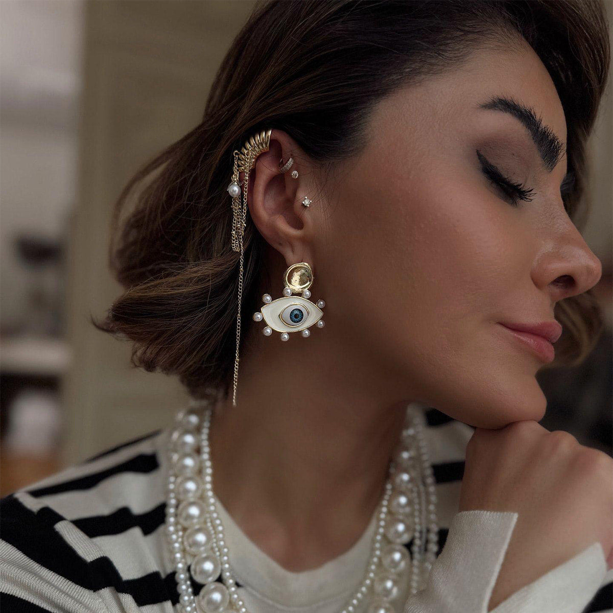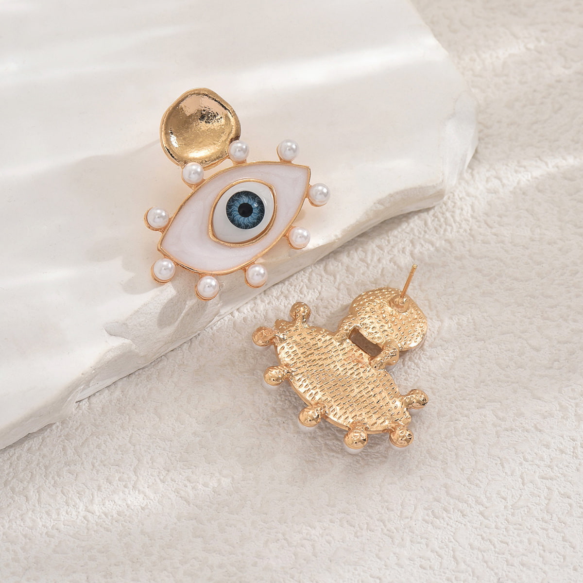 Inspired by the ancient evil eye motif, each earring is artfully crafted with white enamel and lustrous imitation pearls, set in premium quality alloy. The striking blue eye at the center symbolizes clarity and calm, while the pearl accents reflect the purity of divine protection.
