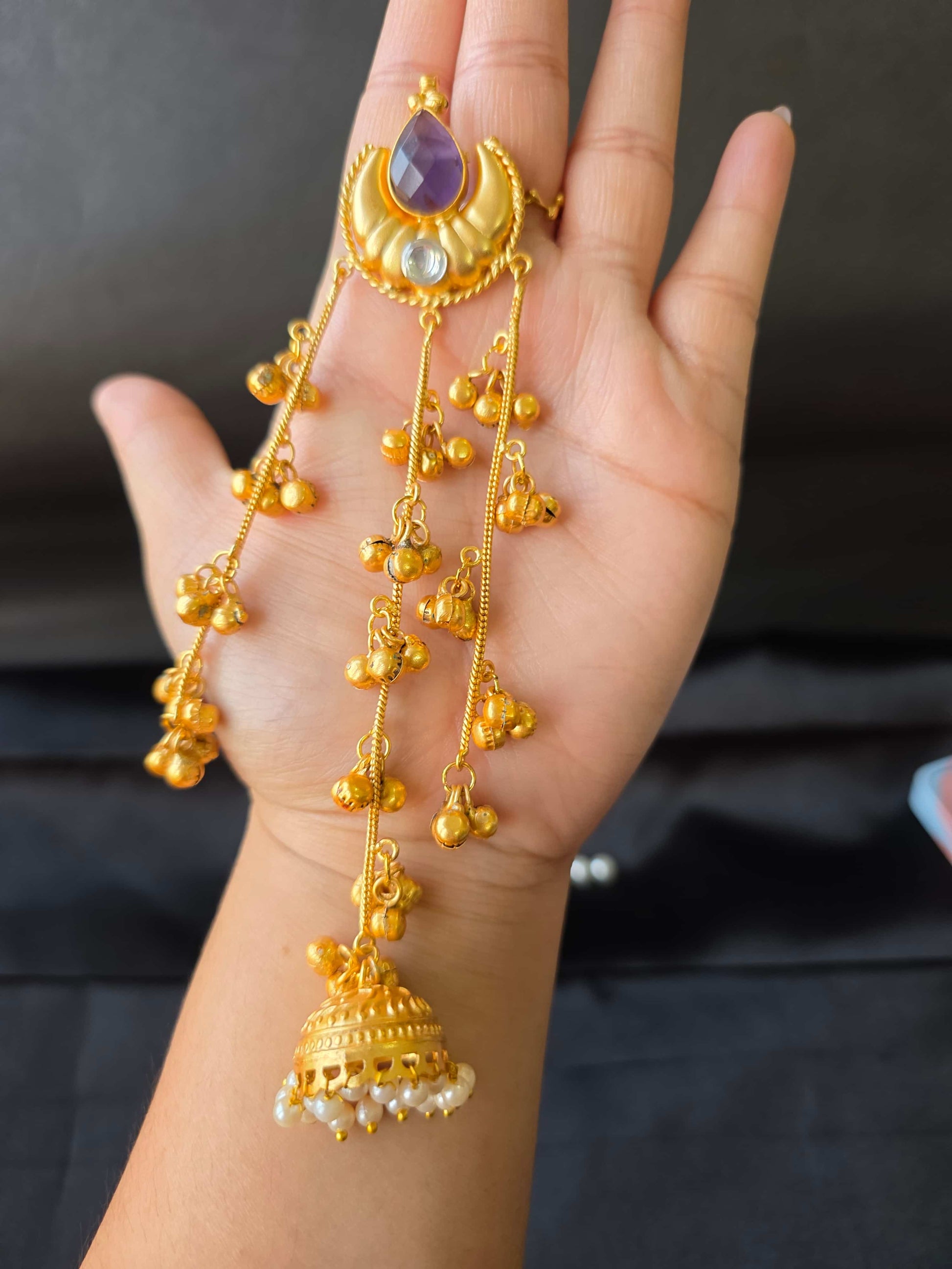 Celebrate elegance and tradition with the Charita Earrings from The Shubhra Collection. Handcrafted in high-quality brass, these statement earrings are inspired by classic Kashmiri jewellery and feature a vibrant green stone at the top. The cascading chains of ghungroos create graceful movement, while the engraved golden discs at the base, edged with delicate pearls, add a regal finishing touch.