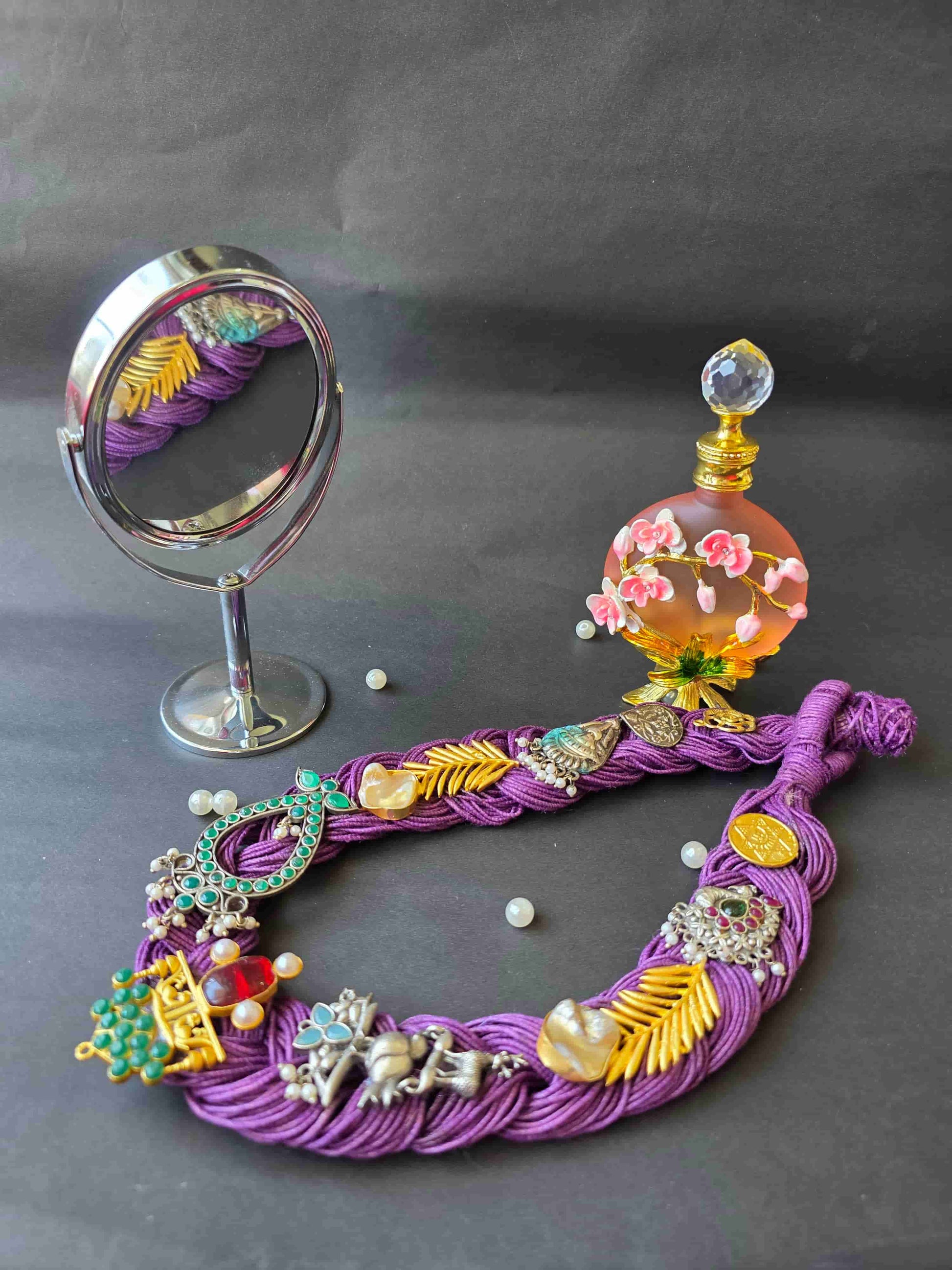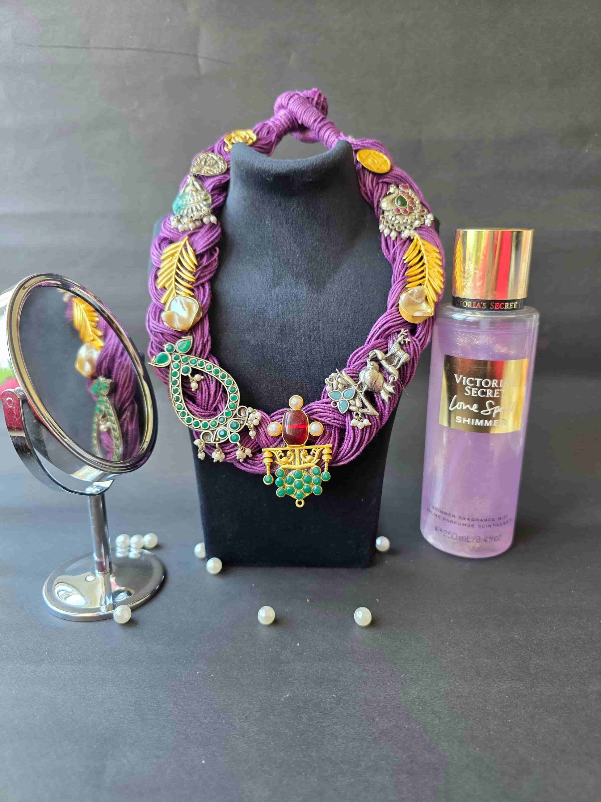 The Devyani Paat Necklace from The Shubhra Collection is a celebration of modern artistry rooted in tradition. Handcrafted with braided purple jute, this statement necklace stands out with its rich hue, symbolic of royalty and festivity. Adorned with intricate brass motifs and embellishments, it brings together natural textures and regal accents in a truly unique design.
