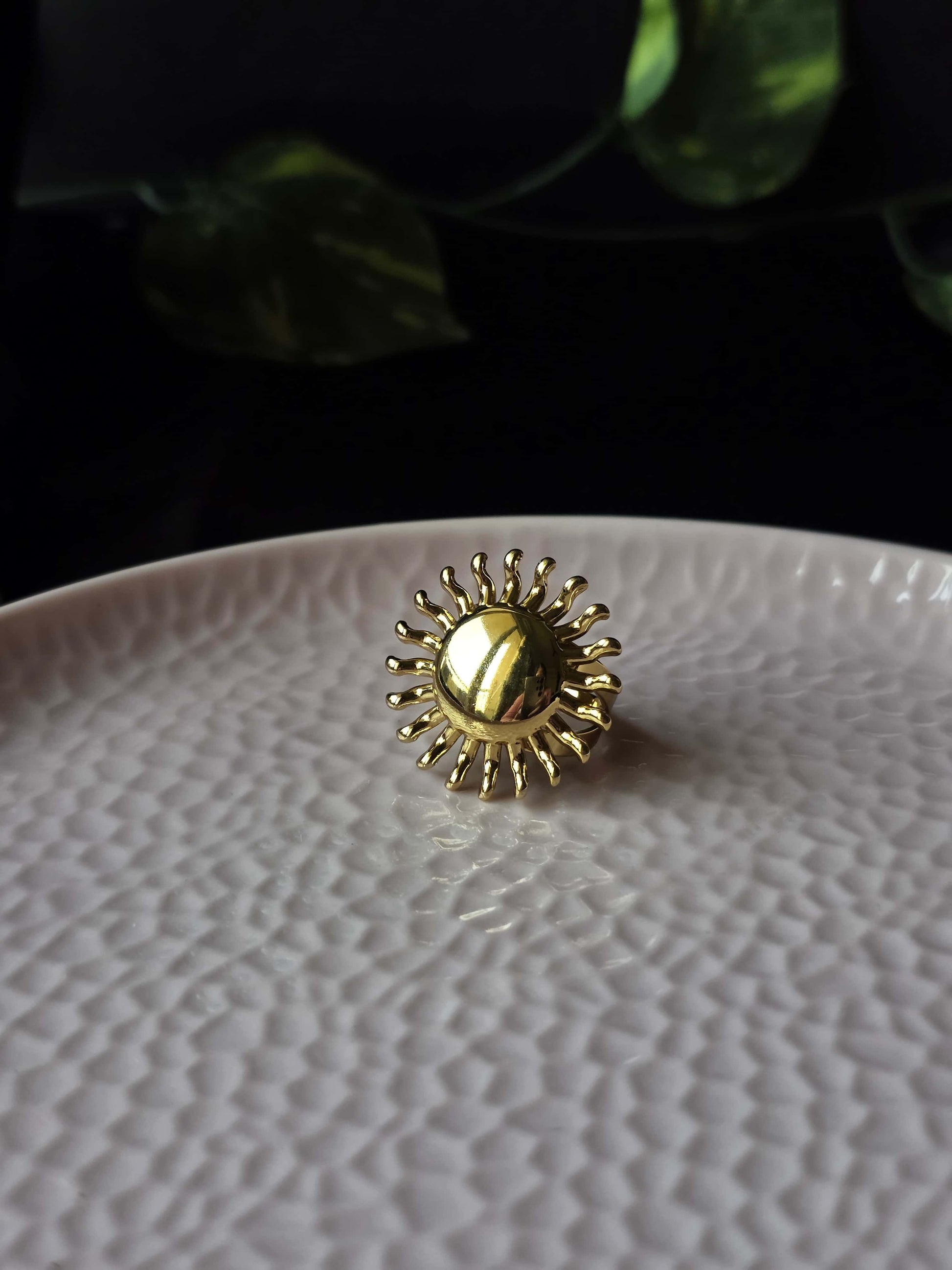 Illuminate every moment with the brilliance of the Elaris Dawn Ring, a striking ode to the sun’s eternal energy. Handcrafted from 304 stainless steel and plated with real 18K gold through advanced PVD coating, this statement ring features a 3D sculpted sun motif — a radiant circular core lifted in gentle relief, surrounded by golden rays that seem to shimmer with life.