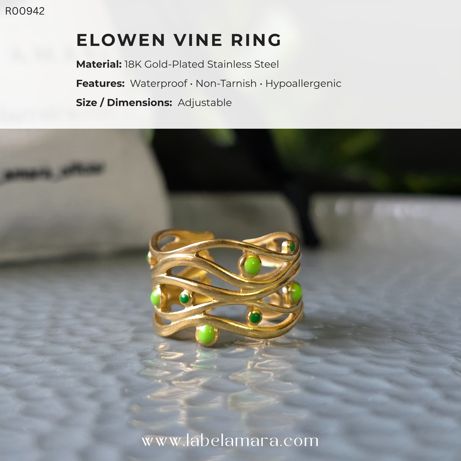 Inspired by the delicate dance of leaves in sunlight, the Elowen Vine Ring captures the essence of organic beauty in motion. Crafted from 18K Gold Plated on 304 Stainless Steel with Ion Plating (IP) Gold, this statement piece features a flowing vine-like structure adorned with vivid green enamel accents, echoing the freshness of spring in every detail.