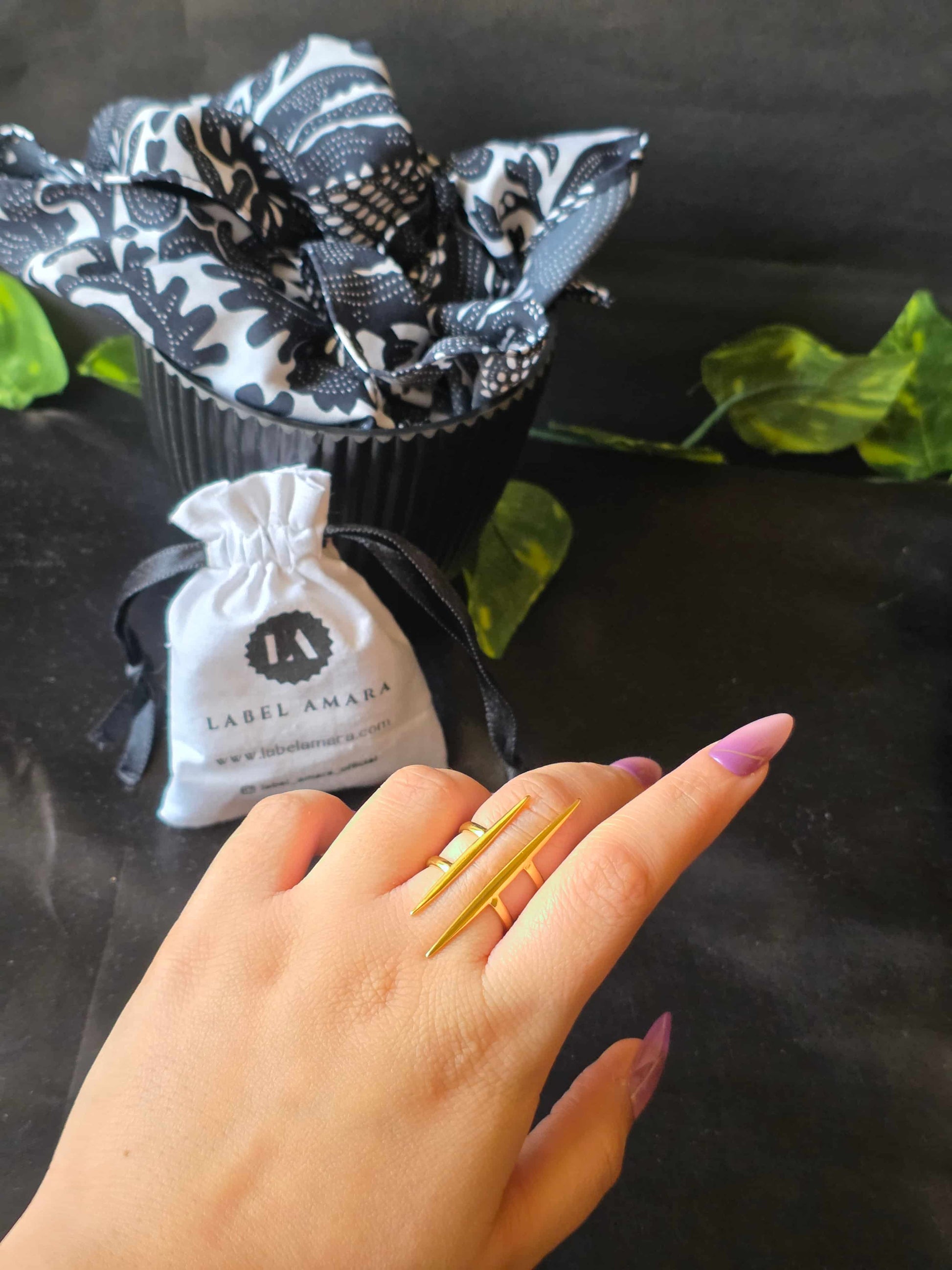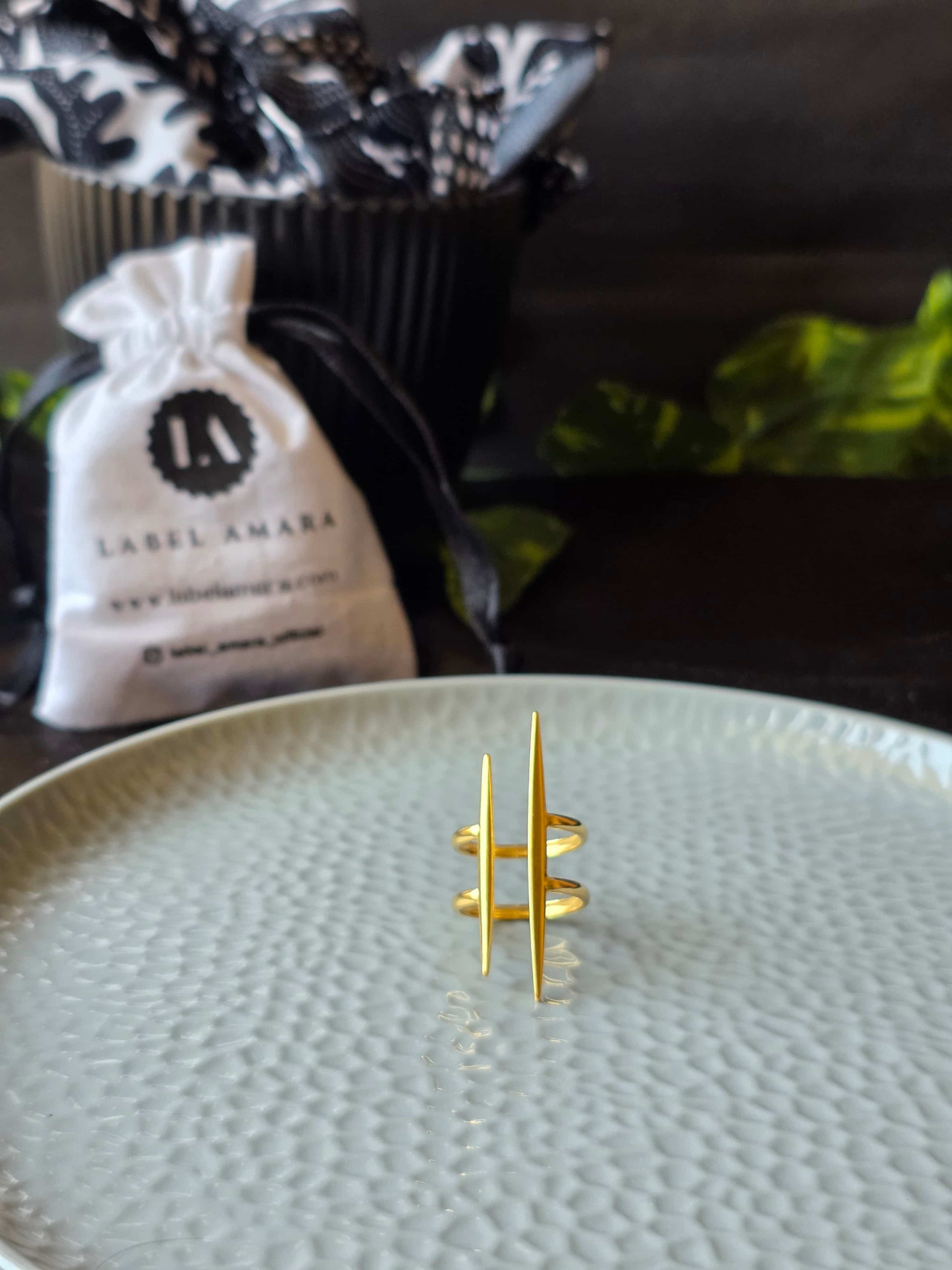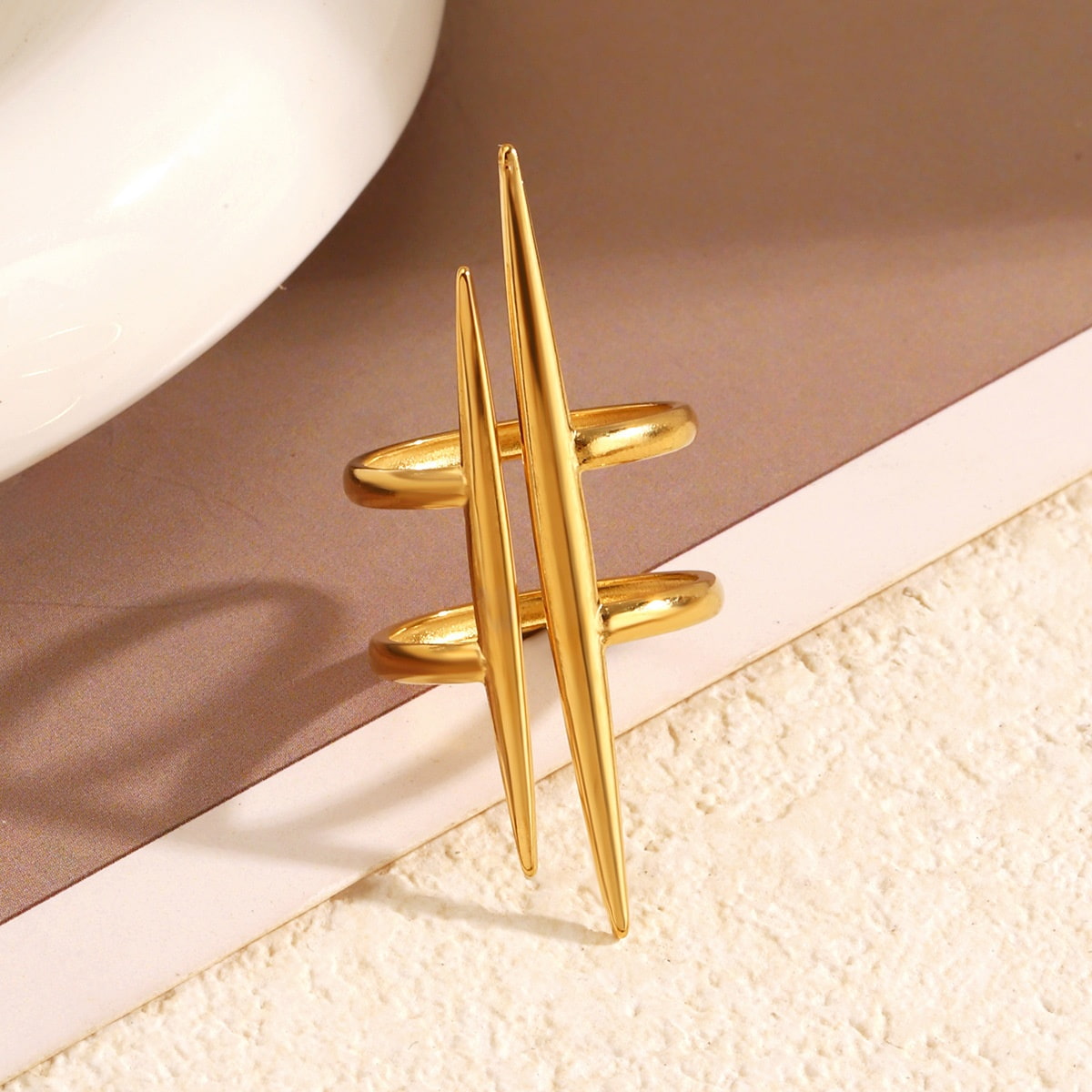 Minimalism meets architecture in the Erynd Axis Ring, a bold statement of refined geometry and balance. Expertly crafted from 18K Gold Plated titanium-coated 304 stainless steel, this sculptural open ring features elongated vertical bars rising from a dual band base — a striking symbol of modern strength and design harmony.