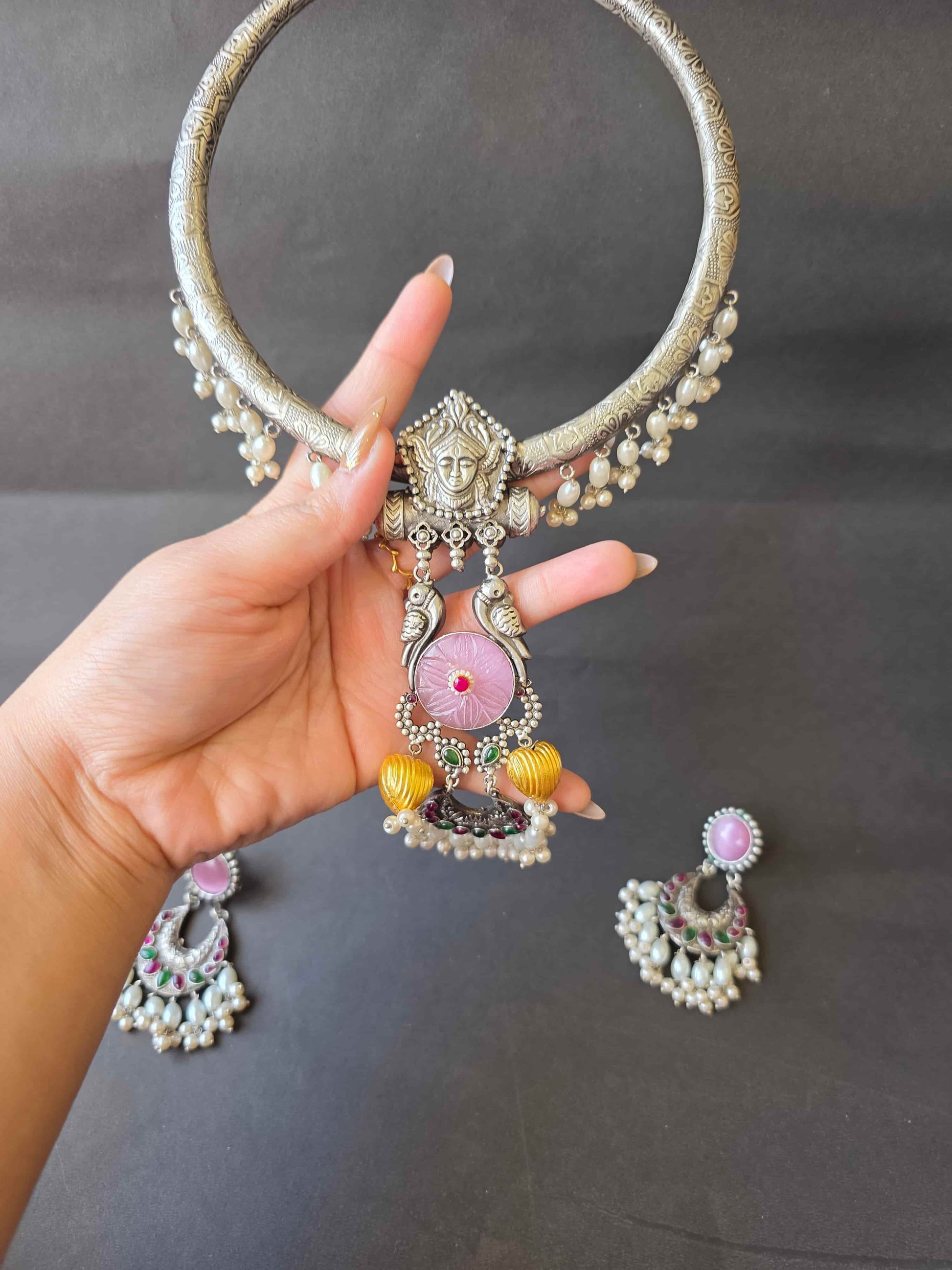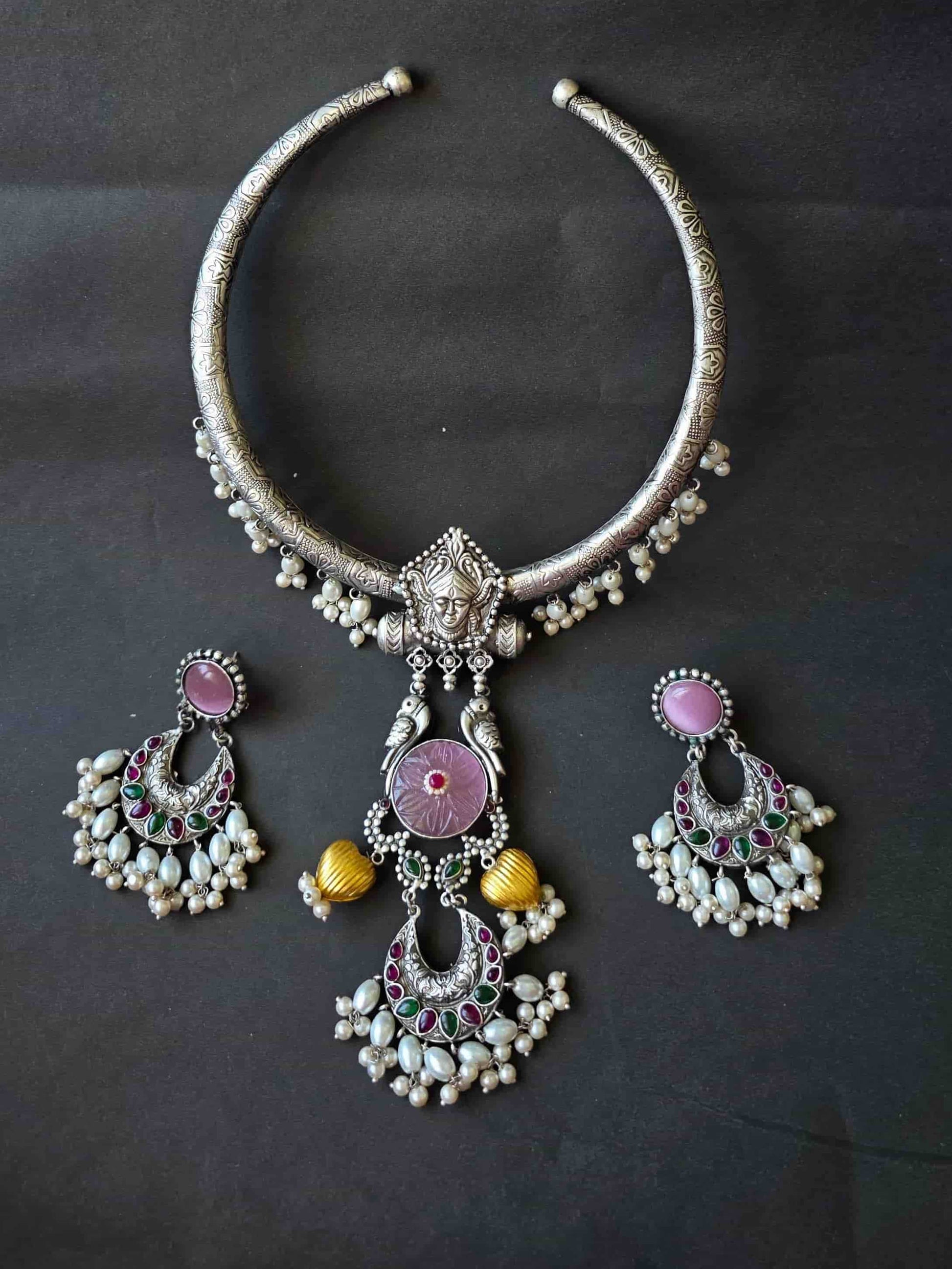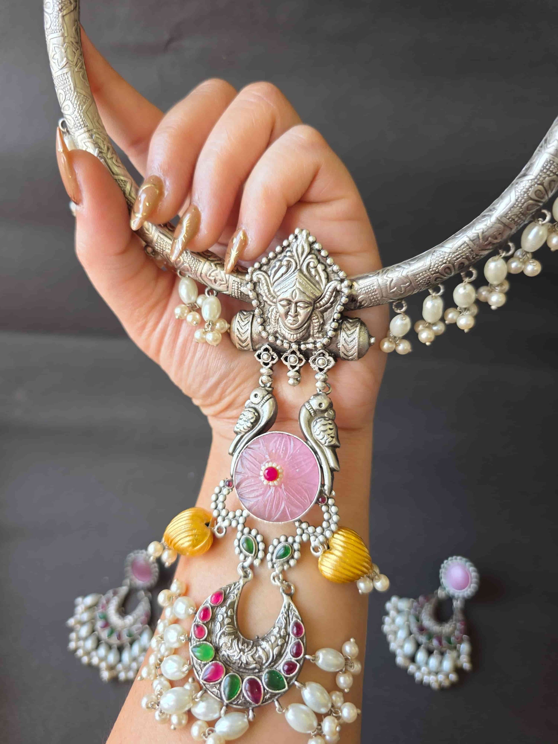 Paired with matching earrings, this set is designed for those who love to make a statement. The hasli silhouette sits beautifully on the neckline, making it ideal for Navratri celebrations, Garba nights, weddings, and grand festive gatherings. A balance of tradition and artistry, Amrita is more than jewellery — it’s wearable heritage.