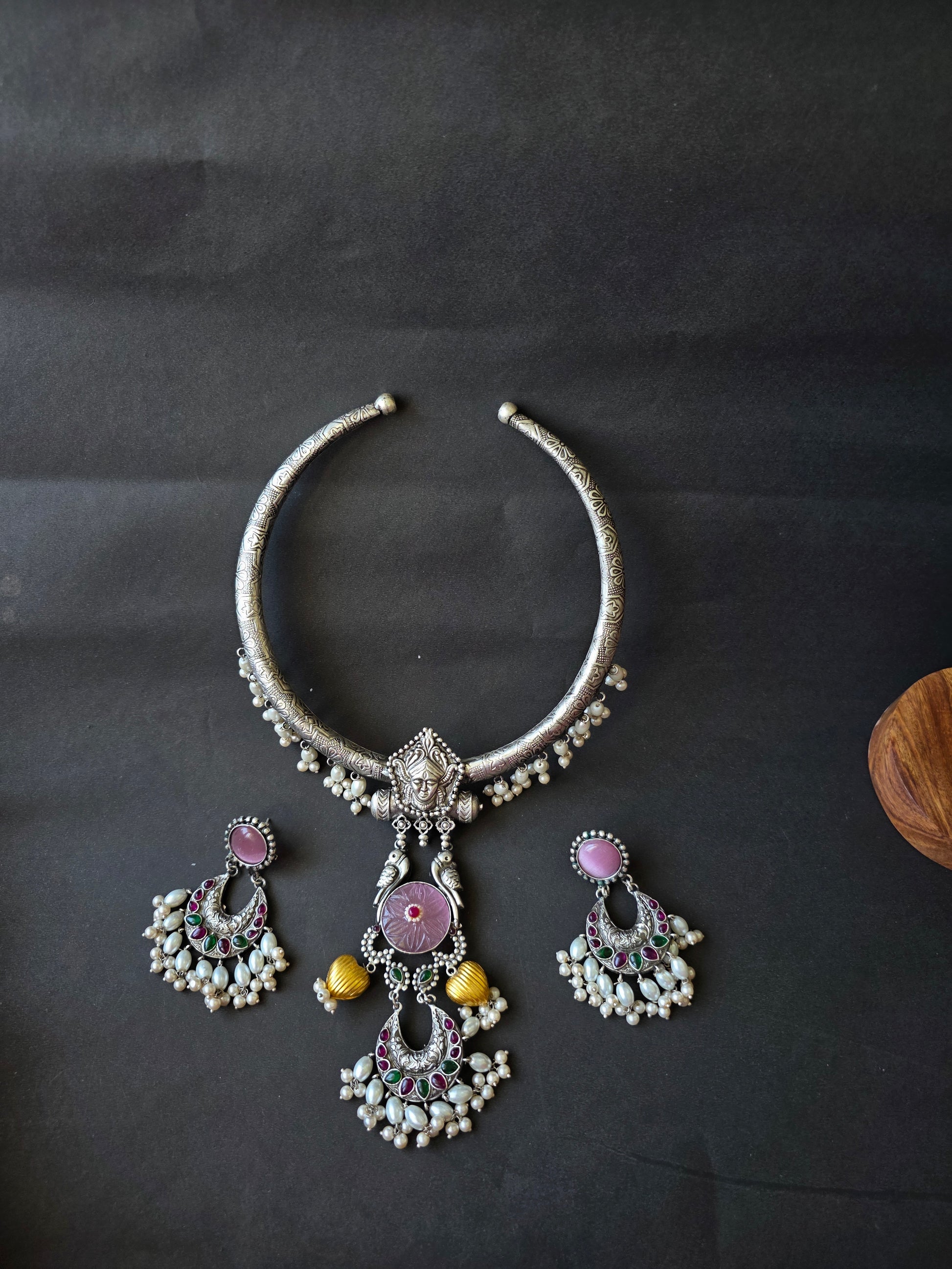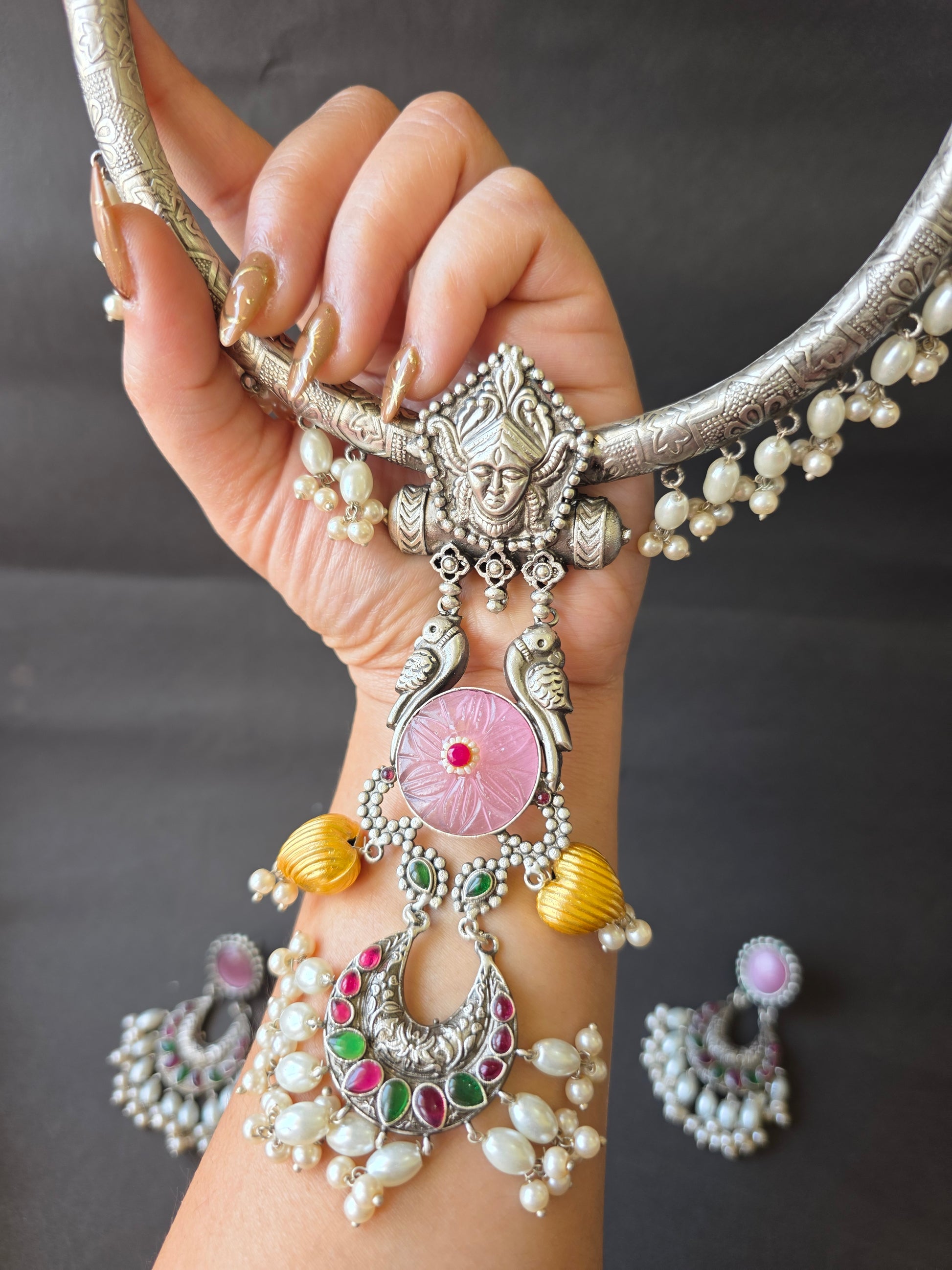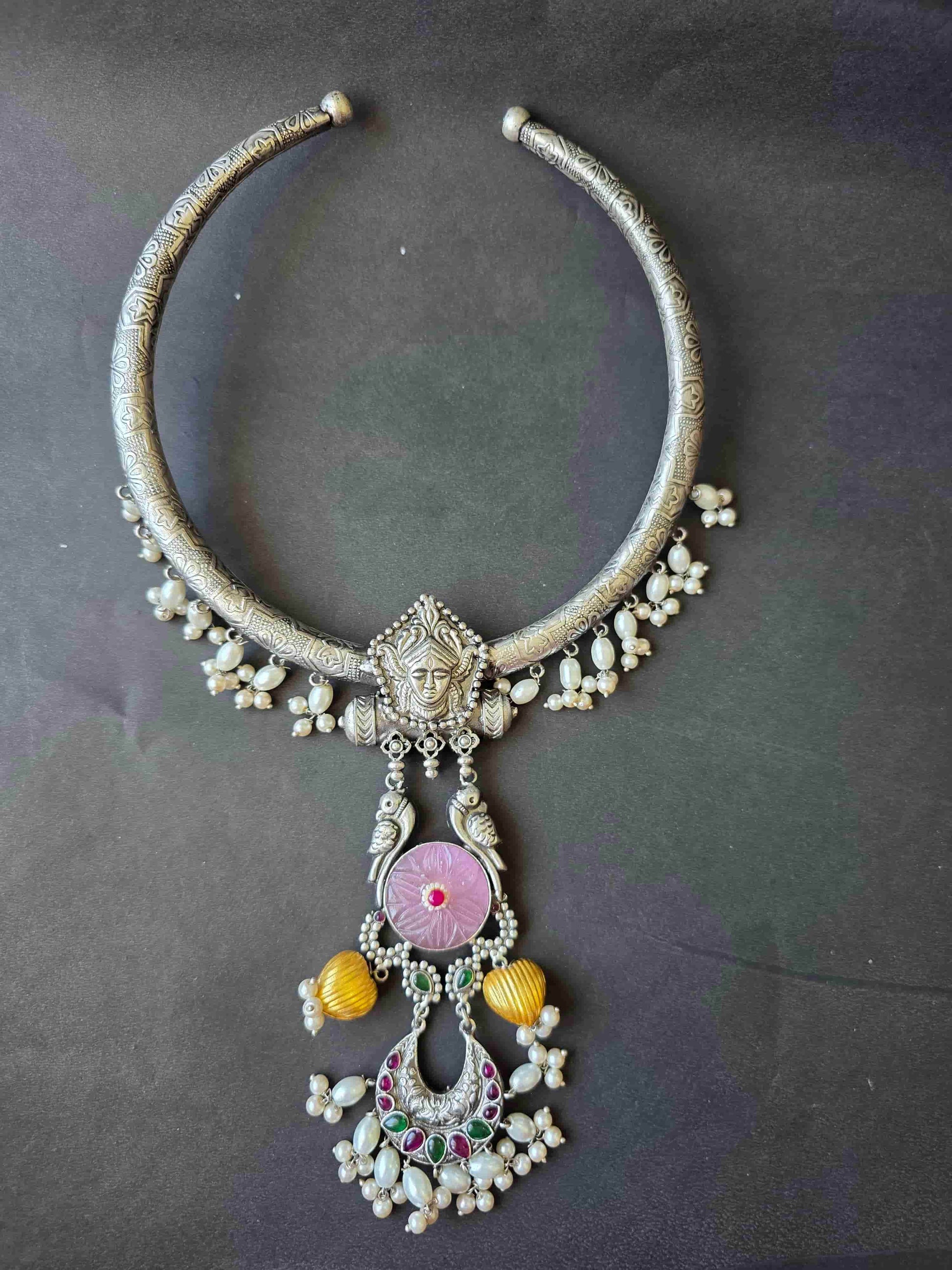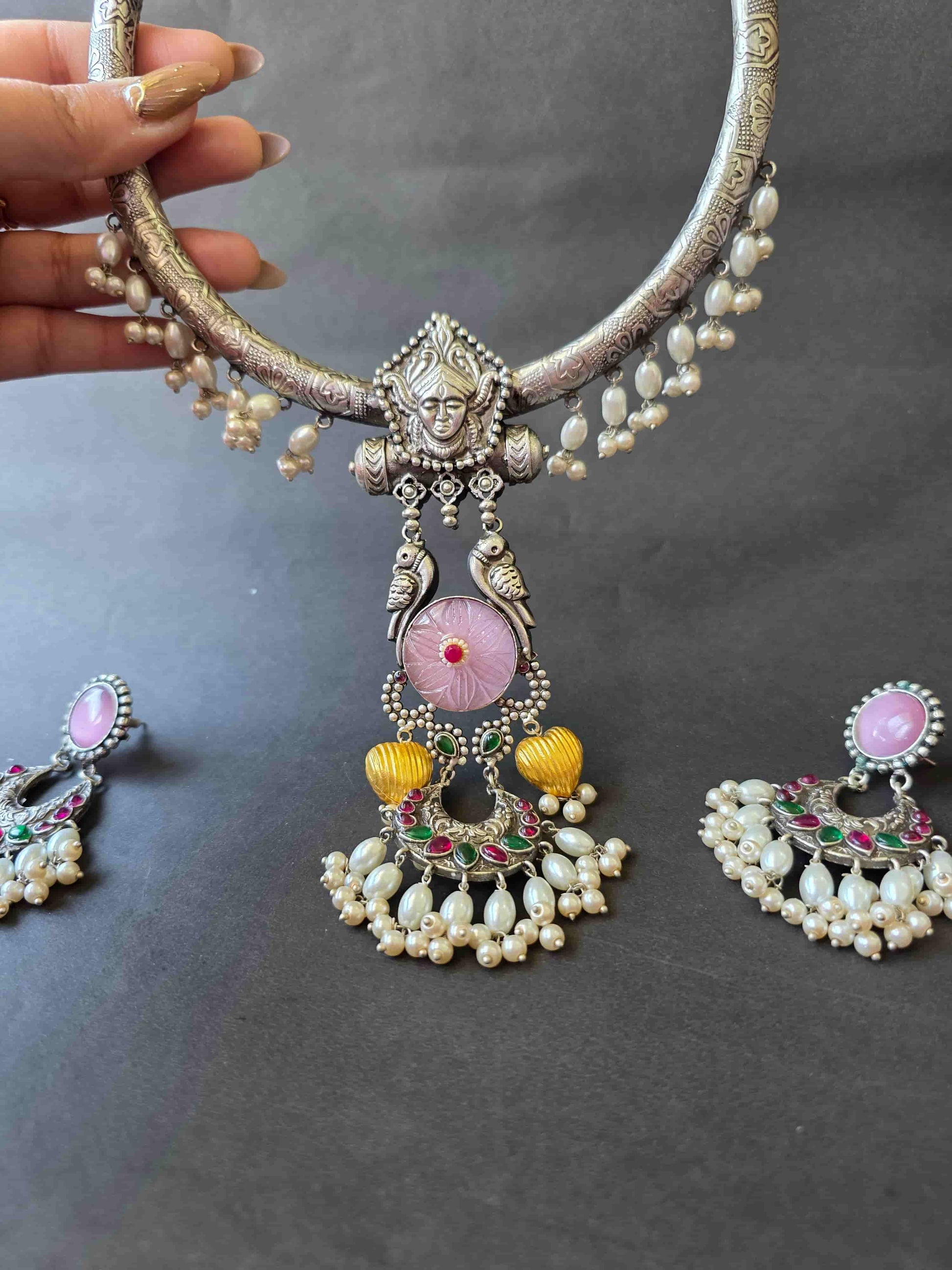 Paired with matching earrings, this set is designed for those who love to make a statement. The hasli silhouette sits beautifully on the neckline, making it ideal for Navratri celebrations, Garba nights, weddings, and grand festive gatherings. A balance of tradition and artistry, Amrita is more than jewellery — it’s wearable heritage.