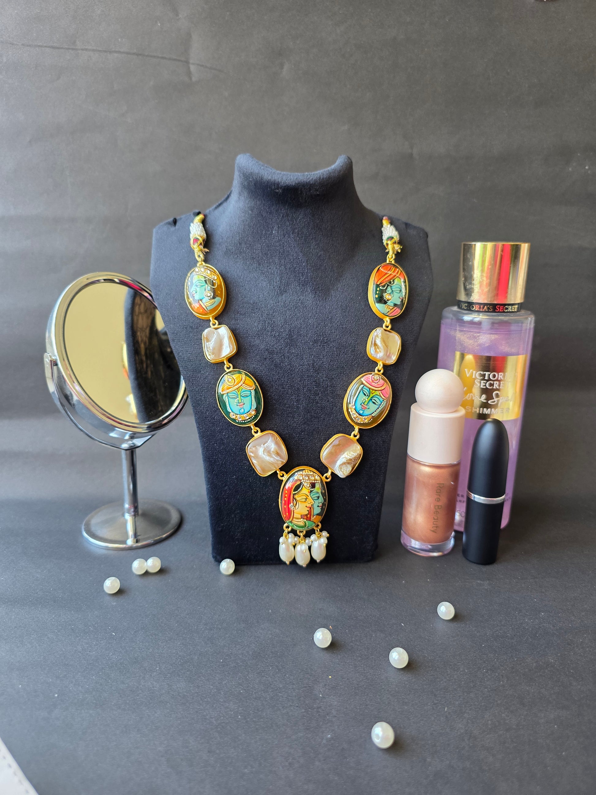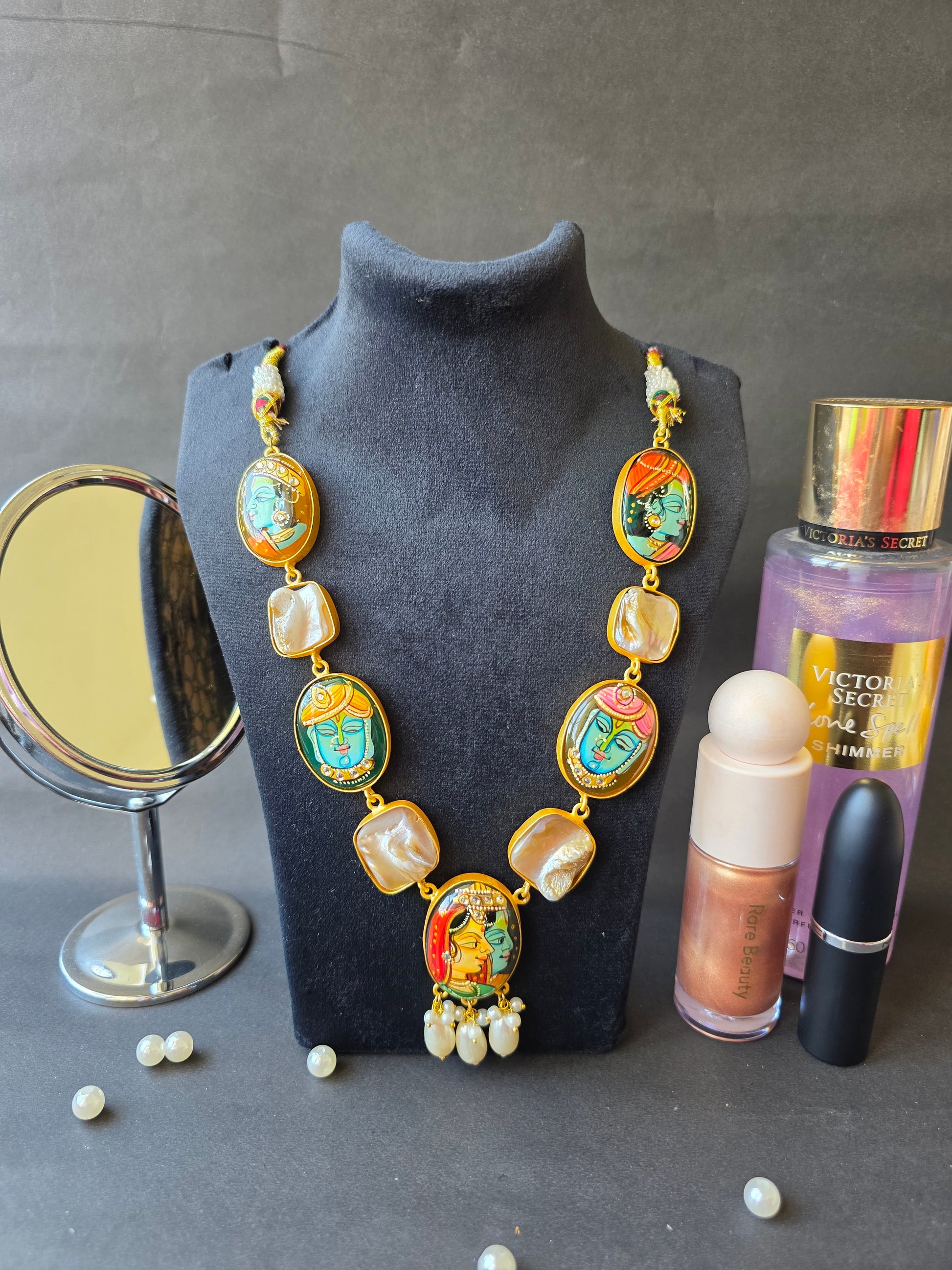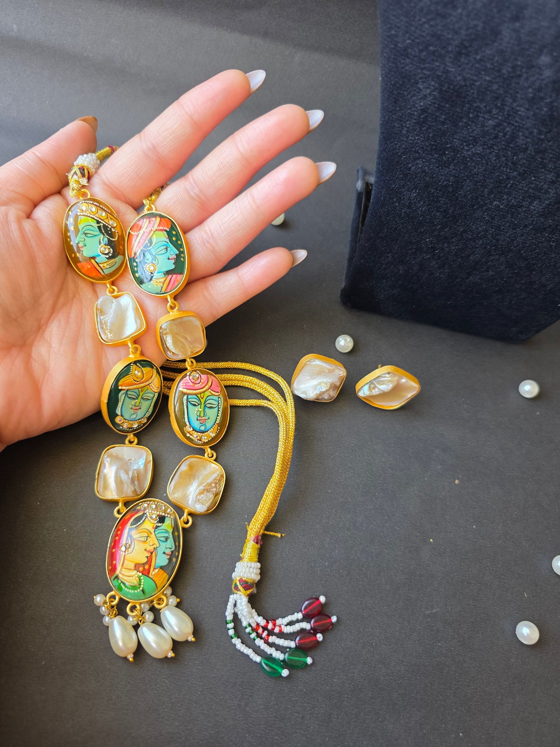 Every stone tells a story — from the handpainted depictions of Krishna’s divine presence to the central Radha–Krishna portrait that symbolizes eternal love. The lustrous mother of pearl detailing adds sophistication, while the carefully set imitation diamonds bring just the right sparkle.