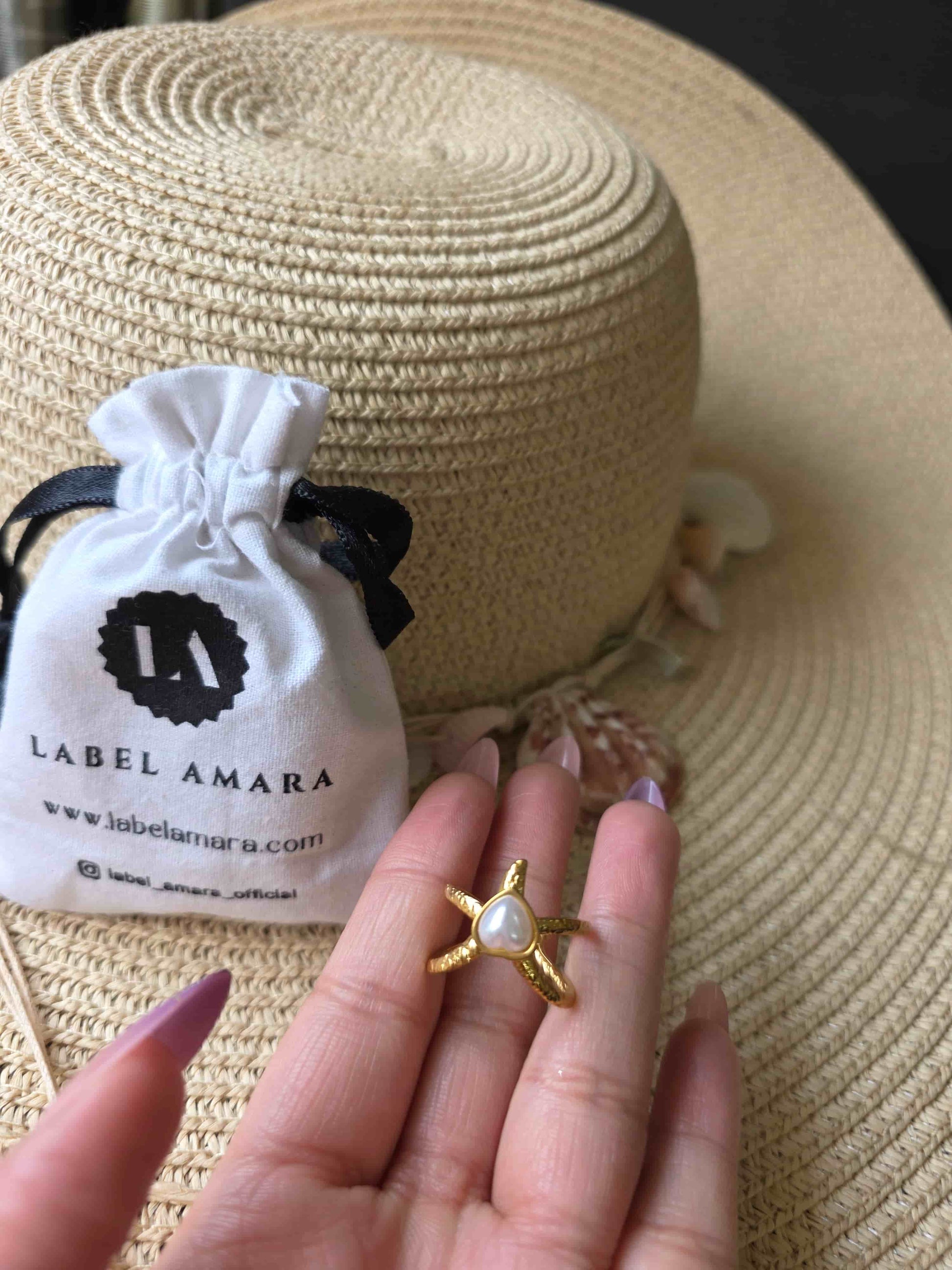 The Maruva Pearl Ring captures the effortless elegance of ocean tides and golden light. Handcrafted from 18K Gold plated on 304 stainless steel with a radiant gold finish, its fluid open design gracefully intertwines around a luminous imitation pearl — symbolizing calm, beauty, and strength.