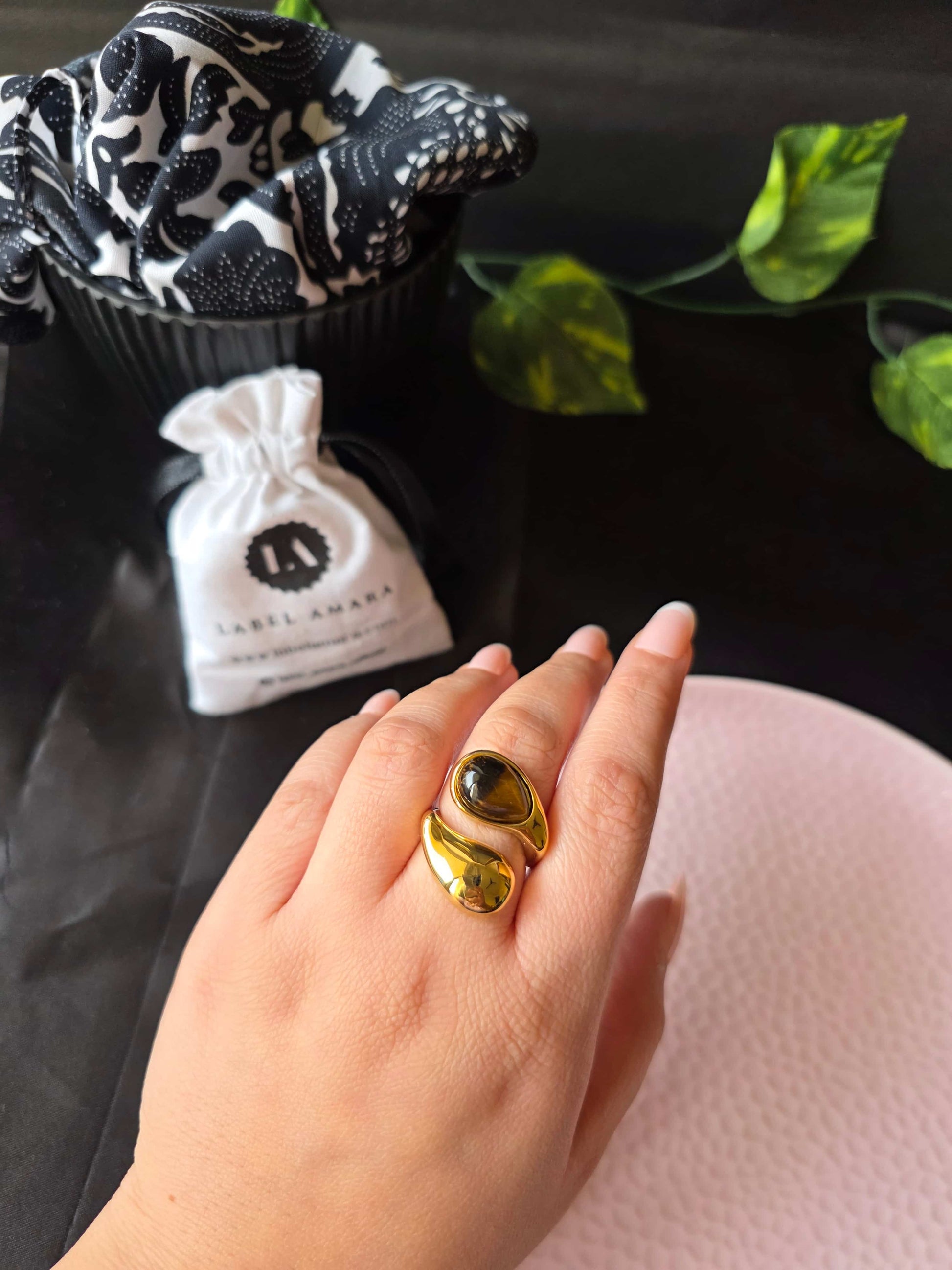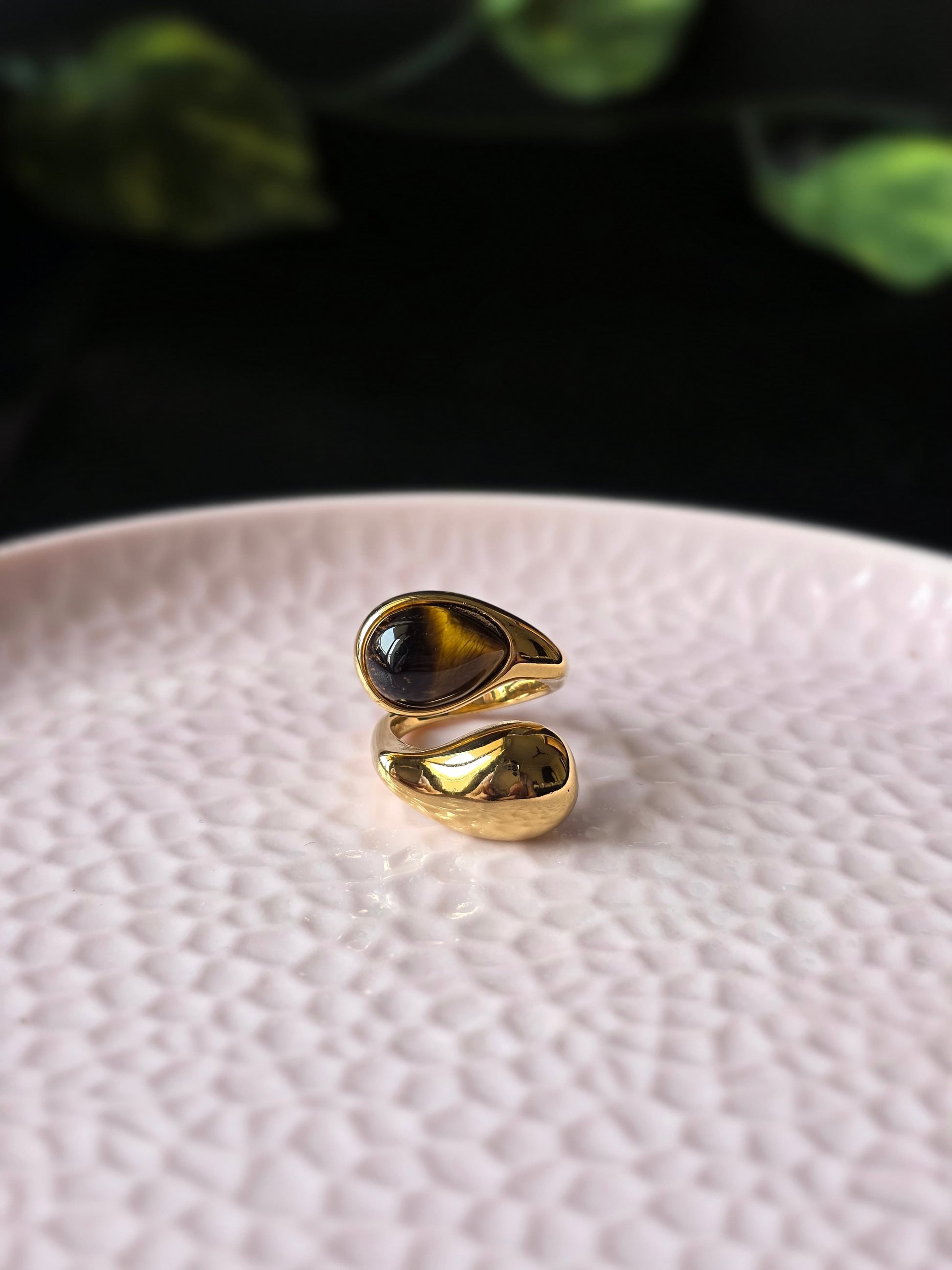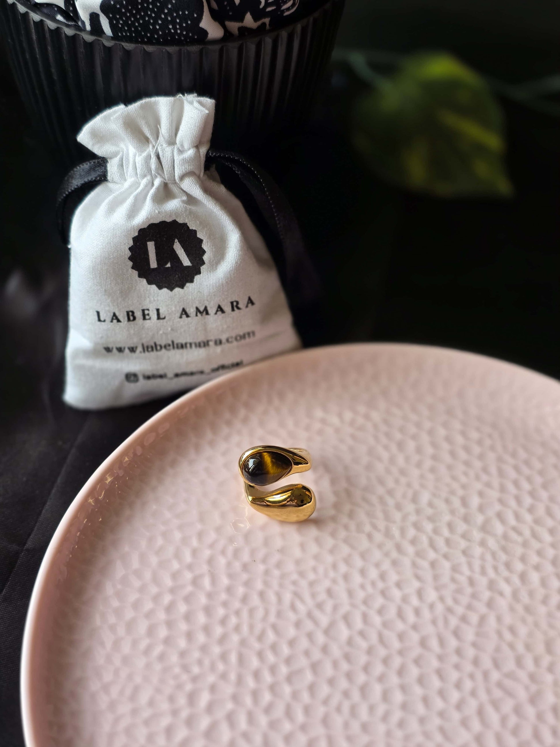 Handcrafted from 16K Gold plated 316L stainless steel with premium ion plating and real gold plating adorned with Natural Pearl or Natural Tiger Eye Stone (Variants), the Meridié Ring is waterproof, hypoallergenic, and non-tarnish, made to shine through every season. Its sculptural form makes it a statement of elegance that feels effortlessly timeless.