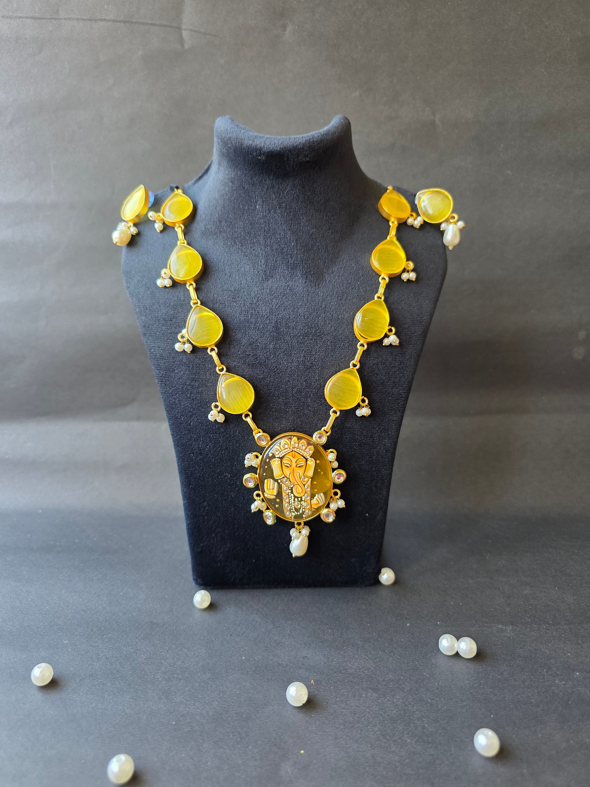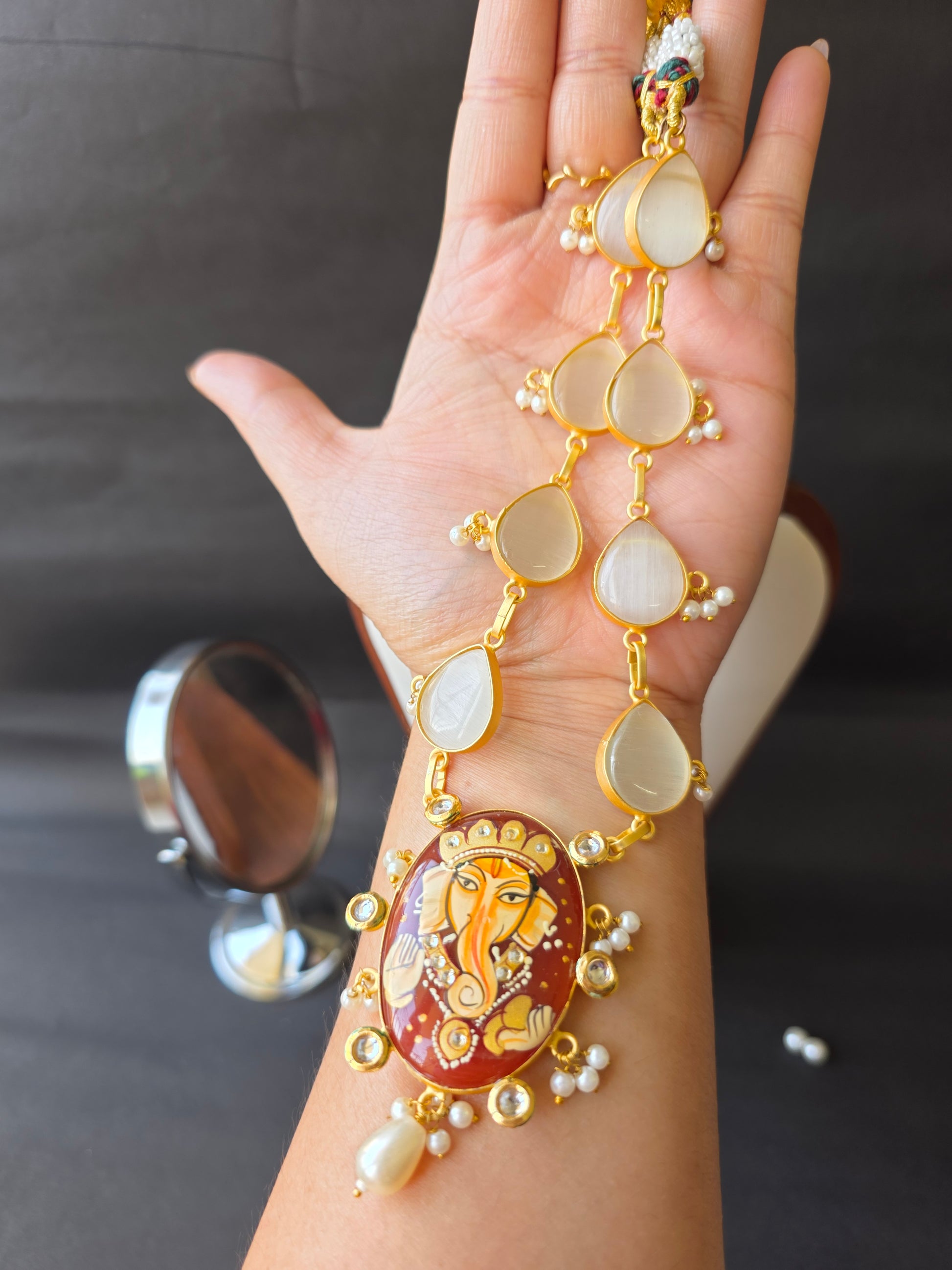 The Morya Necklace Set from The Shubhra Collection celebrates the divine presence of Lord Ganesha through timeless craftsmanship. Handcrafted in luxury brass, this exquisite necklace and earrings set showcases Tanjore-style handpainting of Ganesh Ji on the central stone, beautifully framed with intricate detailing and imitation nags for a touch of indian ethnicity and beauty.