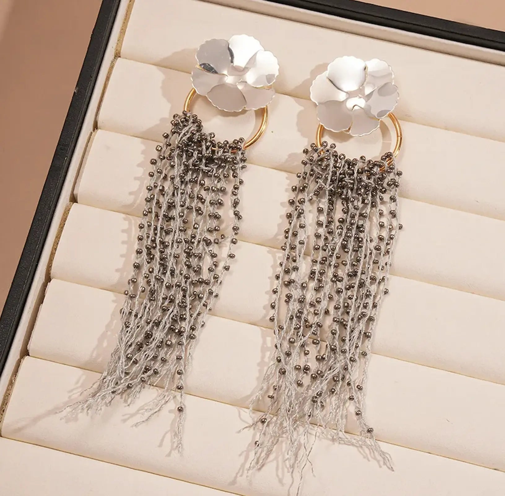Each pair features a sculpted metallic floral top with silver needle and intricate detailing, from which delicate beaded tassels flow like liquid light. Available in two exquisite variants — gold with ivory tones and silver with graphite beads — these earrings embody timeless duality: radiant warmth and serene coolness.