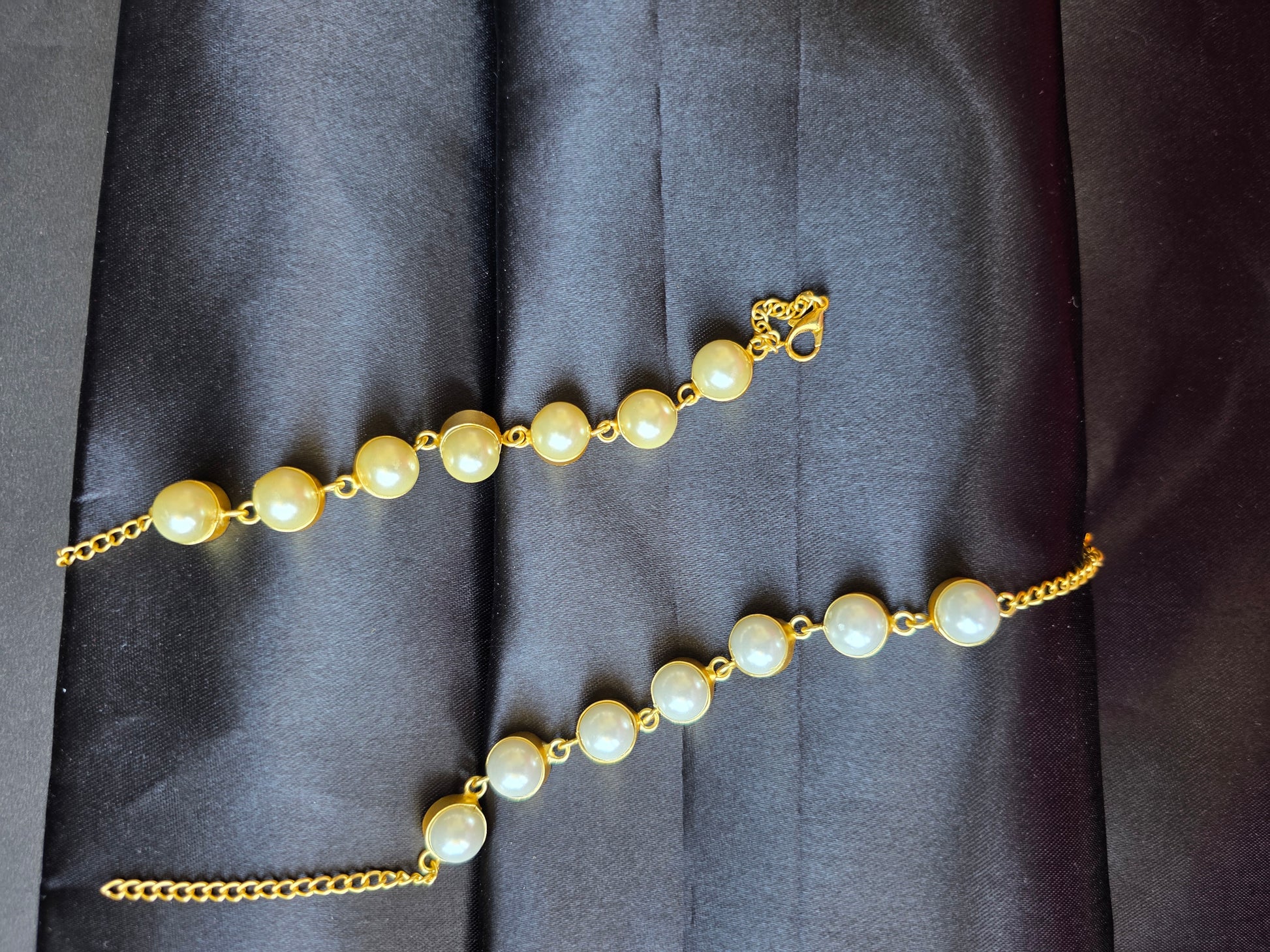 The Samaira Pearl Bracelet from The Shubhra Collection brings a touch of classic grace to your jewellery box. Handcrafted in premium brass, this bracelet is adorned with high-quality imitation pearls that radiate a soft, luxurious sheen, making it perfect for both everyday wear and special occasions.