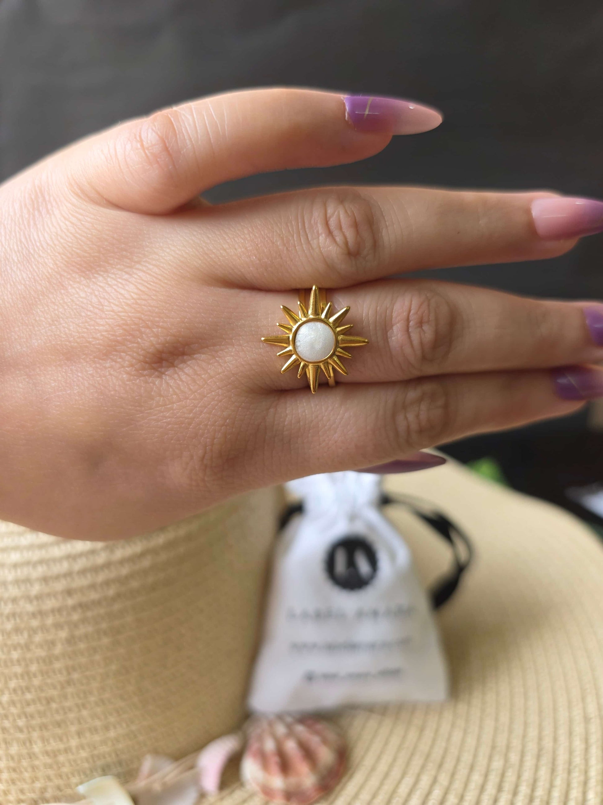 Radiant and refined, the Serenith Halo Ring captures the beauty of sunlight frozen in gold. Handcrafted from 304 stainless steel and plated with real 18K gold using PVD coating, this luminous piece features a white enamel center encircled by golden rays of varying lengths, forming an artistic sunburst silhouette.
