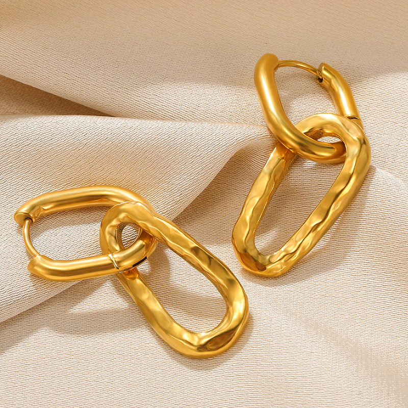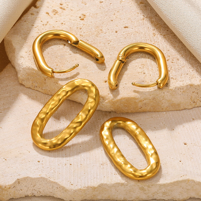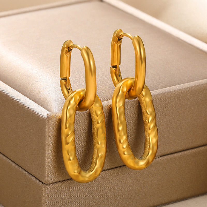 The Verane Link Earrings redefine minimal luxury through pure form and enduring craftsmanship. Made from 304 stainless steel with 18K real gold plating using PVD technology , each earring features a smooth oval silhouette with a subtle hammered texture — reflecting light in soft, sculptural waves.